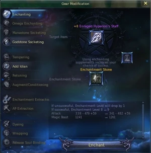 In order to use it, the player must Double Left Click/Right Click the enchantment stone and then select the piece of equipment they wish to enhance, causing the Gear Modification window to appear.