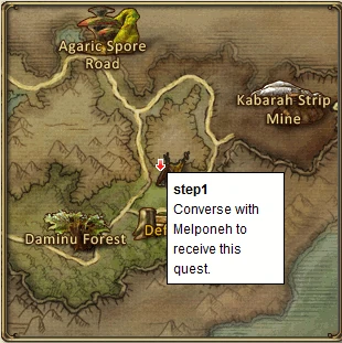 Talk with Melponeh to obtain quest. Kill Fearless Fungies and obtain 3 Fungie's Hearts. Go back and talk with Melponeh and receive reward.