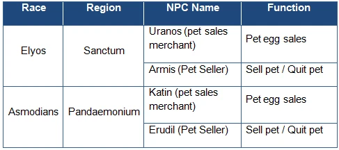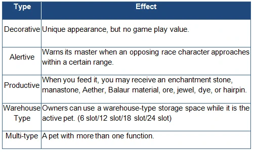 - Functional pets can be purchased with Kinah, or be obtained as quest rewards.