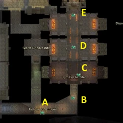| E | Middle path in Lym Ore Grinder, in the middle, before going up the steps to exit the chamber. | |