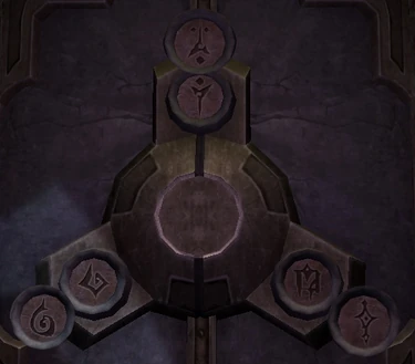 The door has three slots, each one showing three different glyphs at a time. Different glyphs can be shown by interacting with each slot. Interacting with the centrepiece will confirm the confirmation and use up one attempt (and open if its the correct one). The difficulty with this puzzle is that a group may only attempt three times a combination in order to open the door. Otherwise, it will not open at all and the group will be forced to go the long way around.