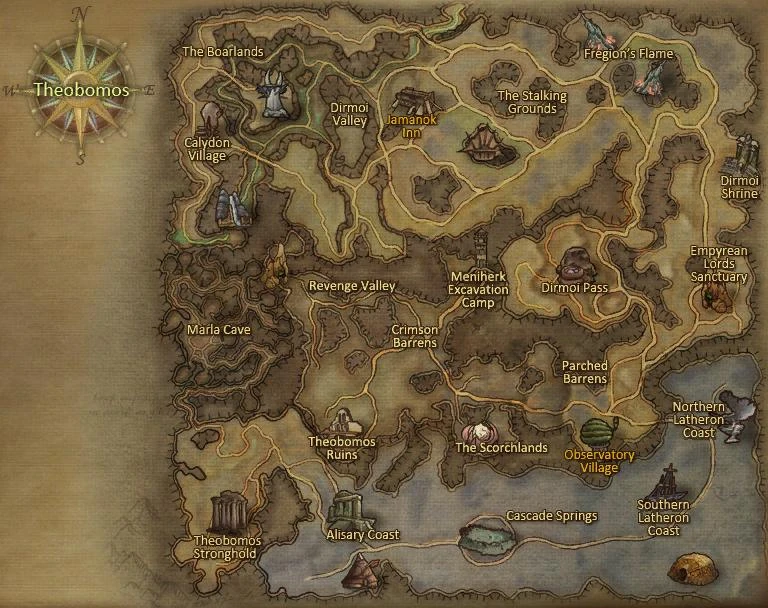 Once a lush and fertile land, all that remains of Theobomos in the present day is a barren wasteland. Fregion burned the lands with his flames in the aftermath of a Balaur invasion, and some of his flames still burn bright in The Scorchlands and Fregion's Flame areas even now, keeping the land in its current state. The map is littered with cliffs, mountains formations, valleys and complex cavern systems. The coastal area in the south, now buried under a thick layer of volcanic ash, stands apart from the rest of the map.
